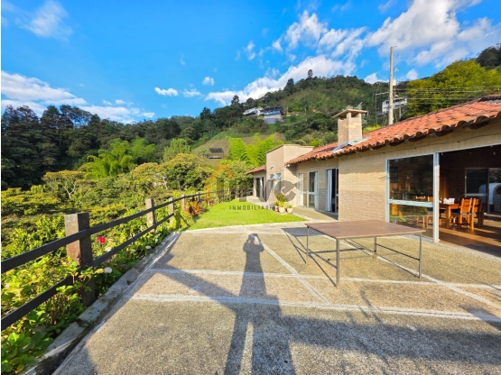 Venta de exclusiva Casa Campestre en Caldas, Antioquia, en lugar privilegiado por su tranquilidad y belleza natural. Con área total de terreno de 3871 M2 y una construcción de 300 M2, esta propiedad ofrece todo lo que necesitas para disfrutar de un estilo de vida tranquilo y rodeado de naturaleza. Cuenta con 4 alcobas cada una con baño y vestier, baño social, concina integral moderna, sala comedor, estudio, chimenea, terraza mirador, zona bbq, patio de ropas independiente, cuarto de herramientas, 3 parqueaderos, amplia zona verde propia y jardin. La terraza es perfecta para disfrutar de la vista panorámica impresionante que registra.